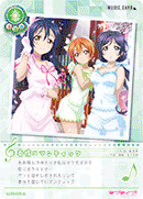 | スキル | 【ライブ中】あなたのステージにいる全員が「lily white」のメンバー(「海未」「凛」「希」)で、3人全員がそろっているなら、♪ライブP+1♪する。 |
