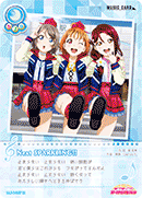 | スキル | 【ライブ参加時】この《ライブ》に参加するメンバーがちょうど6人で、それぞれ名前が異なるなら、共通スコアが6減る。 【ライブ中】この《ライブ》に参加しているメンバーがちょうど9人で、それぞれ名前が異なるなら、♪ライブP+1♪する。 |