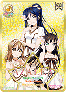 | スキル | 【ライブ中】この《ライブ》に参加している全員が「AZALEA」のメンバー(「果南」「ダイヤ」「花丸」)で、3人全員がそろって参加しているなら、♪ライブP+1♪する。 |